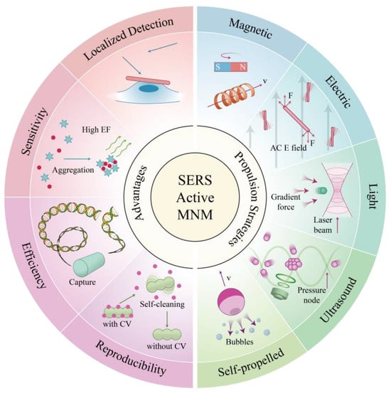 Schematic illustration of the unique advantages and the propulsion strategies of SERS-active MNMs for biosensing applications.
