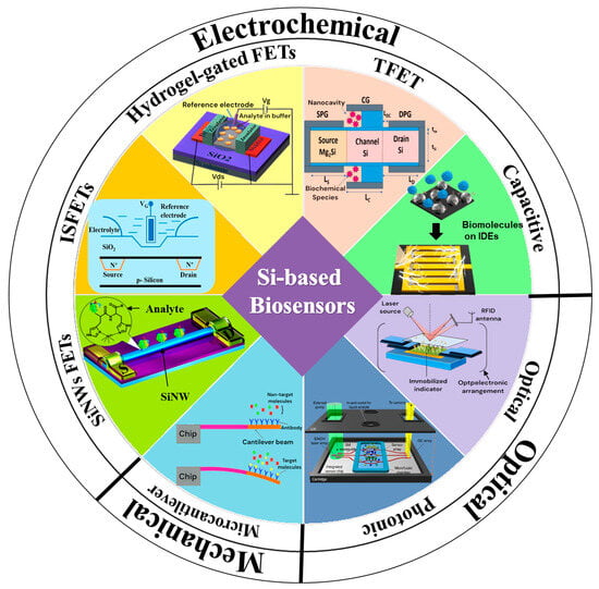 Classification of silicon-based biosensors categorized into three major types: electrochemical, optical, and mechanical biosensors. Each quadrant highlights key sensing mechanisms, including SiNWs FETs, Copyright 2016, Royal Society of Chemistry [54]. ISFETs, reproduced from [55] under Creative Commons Attribution License, 2022. Hydrogel-gated FETs, Copyright 2018, Elsevier [56]. TFET, Copyright 2024, Elsevier [57]. Capacitive, Copyright 2022, Elsevier [58]. Optical, reproduced from [59] under Creative Commons Attribution License, 2011. Photonic, reproduced from [60] under Creative Commons Attribution License, 2021. Microcantilever, Copyright 2024, Springer Nature [61].