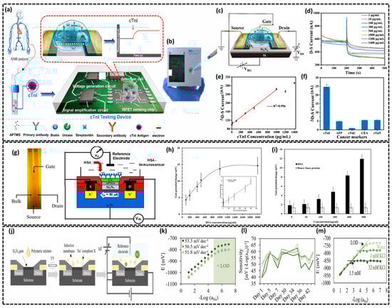 (a) Schematic representation of the detection mechanism implemented in the ISFET-based handheld testing device for cTnI measurement. (b) Photograph of the ISFET-based handheld testing device utilized for the detection of cTnI. (c) Electrode connection configuration of ISFET in the dual-gate mode. (d) IDS current response to varying cTnI concentrations. (e) Linear curve of varying cTnI concentrations ranging from 1 pg/mL to 1000 pg/mL. (f) Specificity test of ISFET biosensor with four different biomarkers. (a–f) reproduced with permission from Elsevier, Copyright [2021]. (g) Top view and cross-sectional view of Si3N4-ISFET biosensor. (h) Relationship between anti-HSA antibody at various concentrations and gate potential change in ISFET. (i) Specificity of has-modified ISFET biosensor for the detection of the HSA protein. (g–i) reproduced from [71] under Creative Commons Attribution License, 2021. (j) Cross-sectional schematic of the Na+ ISFET illustrating membrane deposition procedure and the biosensing mechanism. (k) Calibration plots of Na+ ISFETs over the varying concentration range. (l) The sensitivity of four ISFETs periodically calibrated over a duration of 43 days. (m) Calibration plots of a Na+ ISFET obtained in deionized water and in KCl solutions with varying concentrations. (j–m) reproduced with permission from Elsevier, Copyright [2023].