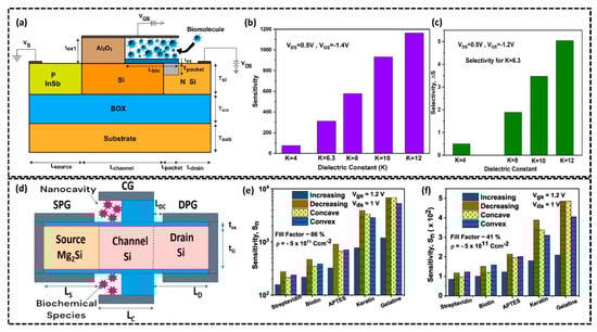 (a) Schematic diagram of InSb/Si TFET-based biomolecule sensor. (b) Impact of dielectric constant on sensor sensitivity. (c) Selectivity versus dielectric constant. (a–c) reproduced with permission from Elsevier, Copyright [2022]. (d) Cross-sectional view DM-DL-DGTFET biosensor. (e) Sensitivity of various step profiles for partly filled cavity at a 66% fill factor, and (f) ~41% fill factor for DL-DGTFET biosensor. (e,f) reproduced with permission from Elsevier, Copyright [2024].