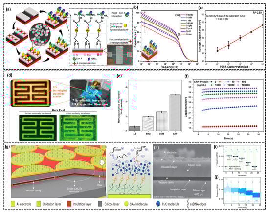 (a) Stepwise fabrication process and schematic illustration of the lectin biosensor: (anti-clockwise) bare Al-IDE; surface modification with linker 2-mercaptoacetate, forming a SAM layer with thiol and carboxylate functional groups; deposition of carboxylic acid-functionalized GNP; immobilization of Con A; detection of the target PSMA. (b) Capacitance as a function of logarithmic frequency for Al-IDE, modified with (i) linker, (ii) GNP, (iii) Con A, and (iv–viii) various concentrations of PSMA; (c) calibration curve utilizing capacitance data for varying concentrations; (a-c) reproduced with permission from Elsevier, Copyright [2021]. (d) Micrograph of 3D interdigital electrode arrays (top left), image of the microfluidic-integrated 3D capacitive biosensor (top right), and fluorescent analysis (before and after) of biofunctionalization on gold electrodes following biological modification and antibody incubation. (e) Capacitance responses to reference biomolecules and CRP. (f) Real-time monitoring measures the variation in capacitance value of the electric sensor as the CRP concentration increases. (d–f) reproduced with permission from Royal Society of Chemistry, Copyright [2021]. (g) Schematic of a CMUTs-based label-free biosensor with Al electrodes designed to detect ssDNA oligonucleotides utilizing a self-assembled monolayer (SAM). (h) Cross-sectional SEM micrograph of fabricated CMUTs cell. (i) Frequency responses with various concentrations of complementary ssDNA measured by the impedance analyzer, and (j) internal ASIC interface. (g–j) reproduced from [85] under Creative Commons Attribution License, 2024.