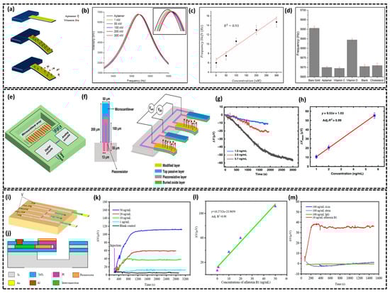 (a) Schematic showing the biosensing principle of the microcantilever biosensor. (b) Time-dependent resonance frequency curves of aptamer-functionalized microcantilevers exposed to varying concentrations of vitamin D. (c) Calibration plot showing the frequency shift in the aptamer-functionalized microcantilever relative to varying concentrations of vitamin D. (d) Specificity evaluation of the aptamer-based assay. (a–d) reproduced from [92] under Creative Commons Attribution License, 2023. (e) The monolithically integrated microcantilever includes a microcantilever array, with analog and digital circuit components. (f) Schematic of the U-shape (left) and piezoresistive microcantilever sensor (right). (g) Results obtained for human IgG measured at varying concentrations. (h) The relationship between saturated voltage changes and varying IgG concentrations. (e–h) reproduced from [93] under Creative Commons Attribution License, 2021. (i) The schematic representation of the quarter-configuration Wheatstone bridge. (j) Cross-sectional view of PI/Si/SiO2 microcantilevers. (k) Measurement results for aflatoxin B1 at concentrations of 1, 10, 20, 50 ng/mL. (l) Linear correlation of the measured output voltage response and aflatoxin B1 concentrations. (m) Detection results for ricin, abrin, and IgG at 100 ng/mL concentrations using microcantilever biosensors functionalized with aflatoxin B1 antibodies. (i–m) reproduced from [94] under Creative Commons Attribution License, 2021.