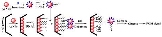 Following the same detection principle, new methodologies were introduced by introducing nanotechnology components, such as gold nanoparticles, for the immobilization of the bioreceptor. Huno et al. [29] described a methodology for the detection of dopamine in serum samples by combining dopamine aptamer in a microwell plate assay. The recognition of dopamine displaces a gold nanoparticle-conjugated DNA, which carries multiple units of invertase enzyme, thus accomplishing a double amplification process if the enzyme-catalyzed hydrolysis of sucrose is accounted for (Figure 4).