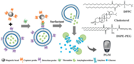 Lin et al. [32] presented a novel assay (Figure 5) for the detection of thrombin and C-reactive protein. In the described method, magnetic particles with immobilized capture aptamers (or antibodies) are introduced into a sample solution where the target protein (thrombin or C-reactive protein) is captured. Subsequently, liposomes with secondary detection aptamers (or antibodies) conjugated with amyloglucosidase-loaded liposomes are added. The aptamers captured the protein and aligned it in their respective secondary complexes. Upon the addition of amylose, the liposomes ruptured and released the amyloglucosidase enzyme, which catalyzed its hydrolysis (Figure 6A), yielding a large amount of glucose that could be quantitatively determined by the PGM. It is important to emphasize that this methodology is a variant of the original approach, where the enzyme used for labeling is not invertase but an alternative that also involves the appearance of glucose as a product of enzymatic hydrolysis.