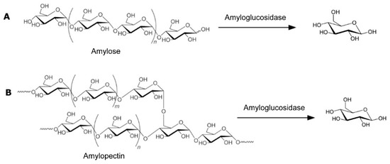 Hydrolysis of starch catalyzed by the enzyme amyloglucosidase (or glucoamylase), differentiating substrate amylose (A) and amylopectin (B). Source: own elaboration.