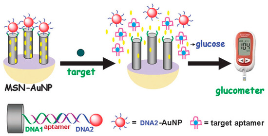 In a third related variant, Tang et al. [36] designed a new ATP detection method and, in this case, used mesoporous silica nanoparticles containing entrapped glucose (Figure 7). The aptamer binds between the DNA1 captured on the silica pore and the DNA2 immobilized on gold nanoparticles. If ATP is present, the aptamer will preferentially bind to ATP. The binding of the aptamer to the analyte breaks the DNA1–aptamer–DNA2 complex and results in the release of the encapsulated glucose. Once the glucose is released into the reaction volume, it can be detected by PGM. Similar to the strategy described, Li and Tang [37] established a cocaine detection system based on the release of glucose encapsulated in titanium oxide nanotubes. Table 2 summarizes the bioassays that employ aptamers and nanocarriers to obtain the glucose signal and are next detected with the PGM.