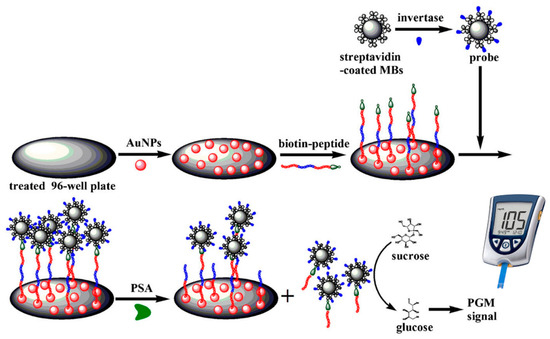 For example, Luo et al. [46] proposed a biosensor based on a peptide-based competitive assay for prostate-specific antigen (PSA), an important biomarker for prostate cancer diagnosis. In the methodology (Figure 9), gold nanoparticles were added to a microwell to immobilize the biotinylated peptide. In parallel, magnetic particles were modified with streptavidin and the enzyme invertase; these were subsequently conjugated to the peptide via biotin. Once the peptide was immobilized on the microplate, if PSA was present, the peptide–biotin–invertase complex bound to magnetic particles was separated from the well plate. The peptide–biotin–invertase supernatant was then separated, and sucrose was added, which, mediated by the enzyme, was degraded into glucose. The amount of glucose detected was directly related to the concentration of PSA.