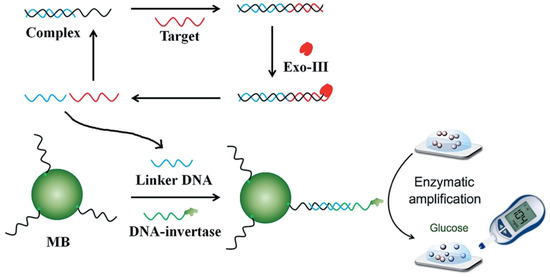 In many fields, such as clinical diagnostics, environmental analysis, etc., detecting specific DNA sequences in a simple, rapid, and sensitive manner has become increasingly important. With them, it may be possible to diagnose inherited diseases or identify pathogenic species or vegetal or animal forms. Xue-tao et al. [49] performed a DNA detection method based on signal amplification techniques assisted by exonuclease III (Exo-III) that catalyzes the cleavage of oligonucleotides on the DNA double-strand in the 3′-5′ direction without affecting the sequences. As shown in Figure 10, a DNA target–DNA-assisted complex is initially formed; if the target to be detected is present, it may hybridize together with the DNA fragment in the complex. The hybridized fragment is transferred to a system containing modified magnetic particles where the linker DNA allows the magnetic particles to bind to the DNA-invertase, hydrolyzing the sucrose so that the DNA fragment can be quantified by correlation to the measured glucose signal [49].