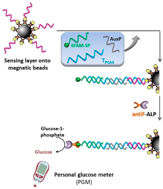 In a distinct study by Arbadia et al. [51], diagnosis of prostate cancer was attempted not through the usual detection of PSA protein antigen, which suffers from low specificity, but through the PCA3 gene, a biomarker present in the urine of prostate cancer patients. In the reported study, PCA3 was detected using a magnetic particle sandwich assay, where alkaline phosphatase (ALP) was used as the signaling enzymatic reaction. The complex formed consisted of a capture probe, the PCA3 target, an auxiliary probe, and the 6FAM signal probe sequence (6FAM-SP), bound onto magnetic particles functionalized with streptavidin and biotin. For signal generation, an antibody conjugated with alkaline phosphatase (antiF-ALP) was used, to which the glucose-1-phosphate substrate was added, and the ALP enzyme catalyzed the hydrolysis of the substrate into glucose, thus generating a signal on a PGM (Figure 11).