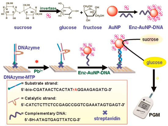 Deoxyriboenzymes, also called DNAzymes, are DNA molecules capable of catalyzing a specific chemical reaction, such as catalyzing the cleavage of a phosphodiester bond. Some of the DNAzymes are activated by binding to a specific analyte and are therefore used as biorecognition elements [53]. Zhang et al. [54] developed a lead ion (Pb2+) detection methodology (Figure 13) using a modified microplate with DNAzyme specific to Pb2+. Upon addition of the ions to the immobilized DNAzyme, the DNAzyme substrate chain was immobilized on the microplate and was cleaved only if lead ions were present. Previously, a complex was prepared between the invertase and gold nanoparticles and the complementary DNA fragment that hybridizes with the cleaved DNAzyme. Finally, a sucrose solution was added. The invertase catalyzed the hydrolysis of sucrose, generating glucose that could be monitored in a PGM and thus being able to relate the glucose concentration to that of the lead ion.
