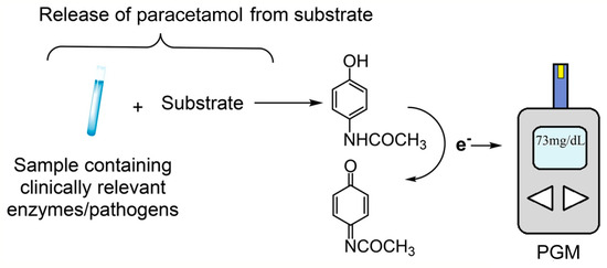 Lately, similar procedures have also been proposed, where the analyte resulting from the activity of the marker enzyme is an interfering substance in the PGM but, as such, provides a signal and, in the absence of glucose, can be properly calibrated. Apart from their direct determination, assays can be devised for substrates generating them as well as detection through the release of paracetamol or catechol with a PGM. Strategies have been proposed where the PGM test strip has neither glucose oxidase nor dehydrogenase present. The generation of paracetamol or catechol, departing from specific substrates and through the usage of their respective proper enzymes, may generate an electrical signal detectable by a PGM (Figure 16). This innovative strategy has been used to detect enzymes such as β-galactosidase and α-mannosidase, as well as viruses such as influenza and bacteria such as E. coli [60]. Table 8 summarizes cases where the PGM has been used to determine interfering substances in the electrochemical determination scheme.