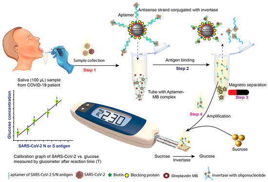 The assay proposed by Singh et al. [63] is based on a quantifiable antigen assay based on the use of aptamers as bioreceptors, with the glucose biosensors being capable of quantification by correlation with the glucose concentration (Figure 17). The biotin-labeled aptamer, specific for the nucleocapsid (N) or spike (S) protein of SARS-CoV-2, is conjugated by magnetic particles, and the aptamer-oligo-invertase complex is prehybridized. In the presence of viral antigens, the invertase-antigen-oligonucleotide complex can be separated. After magnetic separation, the aptamer-antibody-invertase complex is collected, and sucrose is added; the enzyme catalyzes the hydrolysis of sucrose, being the sensor reading is proportional to the viral concentration in the sample.