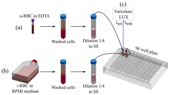 Schematic of the experimental process for washing healthy erythrocytes (u-RBC) anticoagulated with EDTA (a) and infected erythrocytes (i-RBC) from RPMI culture media (b), followed by dilution and reading. The washed cells were diluted in saline solution (SS) and spread in a 96-well plate, achieving a final hematocrit of 25%, before excitation (λex) and emission (λem) readings were taken using the Varioskan LUX (c).