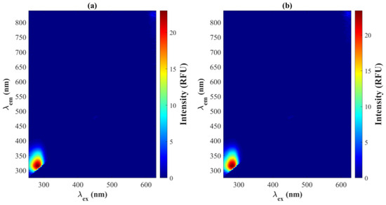 Excitation–emission matrices (EEM) for (a) u-RBCs and (b) i-RBCs. Key differences between the signals are not visible to the naked eye, which prompted the use of Principal Component Analysis (PCA) to identify significant variations in fluorescence.