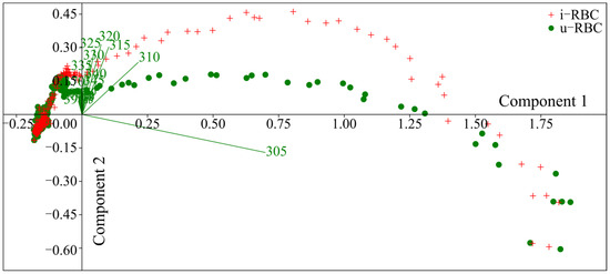 Since the EEMs contain irrelevant information (values with zero intensity), a Principal Component Analysis (PCA) was conducted to reduce the dimensionality of the matrices. This analysis allowed us to identify the variables with the highest loadings in the covariance of the samples and to plot the new components. The PCA was performed in segments since the analysis of the complete matrices did not show many differences. The first segment covered excitation wavelengths from 255 to 300 nm; the second, from 305 to 400 nm; the third, from 405 to 500 nm; and the last, from 505 to 630 nm. Only the second segment, from 305 to 400 nm of excitation, showed significant differences between the u-RBC and i-RBC matrices. As shown in Figure 3, the biplot of the first two principal components in the second segment reveals that seven wavelengths, from 305 to 335 nm (green lines), have higher loadings for differentiating i-RBCs (red crosses) from u-RBCs (green dots).