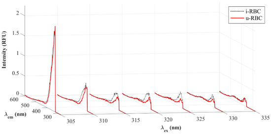 The EEMs of u-RBCs and i-RBCs were recorded in 200 µL of previously washed and diluted samples. The schematic configuration of the study included a sweep in the excitation (λex), running from 255 nm to 630 nm, with a bandwidth of 5 nm and steps of 5 nm, spanning a total of 76 excitation wavelengths. The fluorescence emission (λem) of the samples was measured for each excitation wavelength, ranging from λex +22 nm to 840 nm, with 2 nm increments. Before each measurement, the samples were mixed for 5 s at 600 rpm, and readings were taken from the top of the cuvette at a constant temperature of 25 °C, with an integration time of 100 ms for each reading.