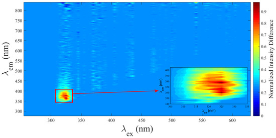 Normalized fluorescence difference in fluorescence intensity between i-RBC and u-RBC. The largest average difference occurs at excitation wavelengths between 315 and 330 nm (see the large colored spot in the zoomed-in graphic).