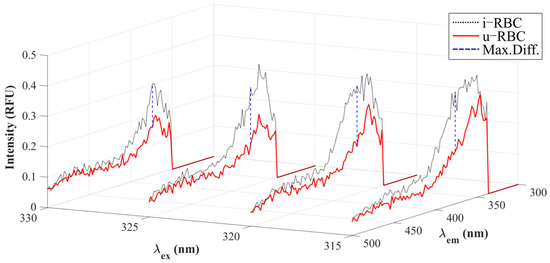 To investigate whether excitation wavelengths could differentiate between i-RBCs and u-RBCs, we analyzed autofluorescence spectroscopy arrays for both cell types. By evaluating the averages of the EEMs, significant autofluorescence emission was observed in the spectral region between 278 and 390 nm when excitation wavelengths between 255 and 310 nm were used, with its maximum peak at 280 nm in both arrays (Figure 2a,b).