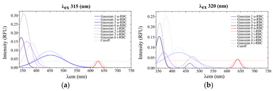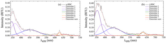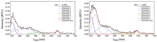Similarly, Figure 8a,b shows the fluorescence peaks of the u-RBC and i-RBC samples, respectively, when excited at 320 nm and their corresponding Gaussian peak sums, which consist of a total of eight peaks.