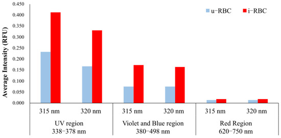 The average intensity in the UV (338–378 nm), where the Gaussian peaks 1 and 2 are located, as well as in the violet-blue (380–498 nm) and red (620–750 nm) regions of the two excitations (315 nm and 320 nm) for u-RBCs and i-RBCs, is shown in Figure 10. The autofluorescence of i-RBCs increased in the violet region by 77% and 97% when excited with 315 nm and 320 nm, respectively. In addition, the bar plot of the average intensity in the violet-blue region showed an increase of 129% with excitation at 315 nm and 119% with excitation at 320 nm. In the red region of the spectrum, the intensities remained relatively constant for both excitations. In summary, the results demonstrate an increase in autofluorescence in the parasitized samples after excitation with 315 and 320 nm.