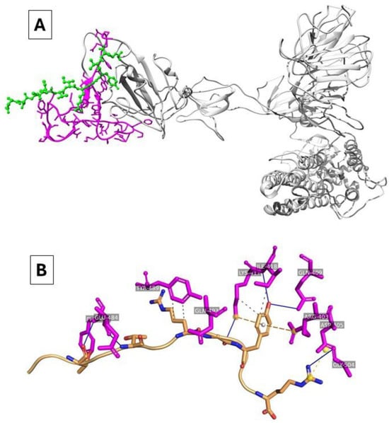 (A) Three-dimensional docking representations for BIAI1 interacting with SARS-CoV-2 Spike-RBD. The Spike protein is represented in grey, BIAI1 in green, and RBD in pink. (B) Three-dimensional interaction map for BIAI with SARS-CoV-2 Spike-RBD. Hydrogen bonds are presented as dotted lines between the peptides and the Spike-RBD complex.
