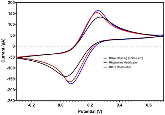 Cyclic voltammograms of a bare screen-printed electrode (black line), electrode modified with R6G at 0.5 mg/mL (red line), and electrode modified with BIAI1 (blue line), using 5.0 mmol L−1 [Fe(CN)6]3−/4− in KCl 0.5 mol L−1. Scans: −0.3 to 0.7 V, E step: 0.002V, and scan rate: 0.075 V/s.