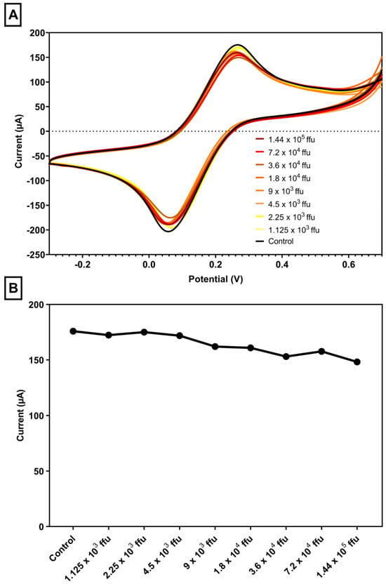 (A) Voltammograms of serial dilutions stratified by viral load. Concentration of 1.44 × 105 focus-forming units down to 1.125 × 103. Analysis was performed using 5.0 mmol L−1 [Fe(CN)6]3−/4− in 0.5 mol L−1 KCl. Scans: −0.3 to 0.7 V, E step: 0.002V, and scan rate: 0.075 V/s. (B) Peak current values: viral load. Scan rate: 50 mV s−1. Analysis was performed using 5.0 mmol L−1 [Fe(CN)6]3−/4− in 0.5 mol L−1 KCl. Scans: −0.3 to 0.7 V, E step: 0.002 V, and scan rate: 0.075 V/s.