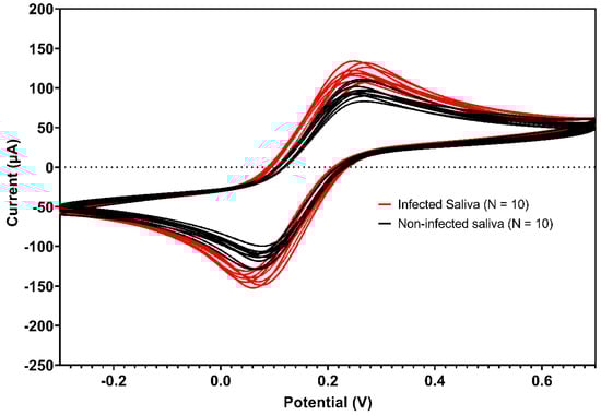 Voltammograms of pooled saliva samples of healthy asymptomatic individuals. The voltammograms illustrate the electrochemical responses for two groups: non-infected saliva, without VSV-eGFP-SARS-CoV-2, in black; infected saliva, with 1.8 × 104 of the virus, in red. Analysis was performed using 5.0 mmol L−1 [Fe(CN)6]3−/4− in 0.5 mol L−1 KCl. Scans: −0.3 to 0.7 V, E step: 0.002 V, and scan rate: 0.075 V/s.