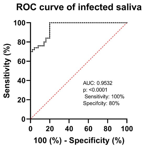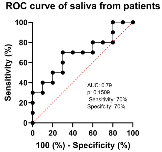 Saliva samples from symptomatic individuals were tested using our AI-generated peptide-based electrochemical sensor. The ROC curve analysis produced an AUC of 0.69, showing moderate discriminating power; however, the p-value of 0.1509 that indicates this discrimination was not statistically significant. Sensitivity and specificity were 70%, emphasizing the potential of saliva analysis for COVID-19 identification and the need for additional diagnostic refinement and validation. In this context, the composition of saliva in infected individuals has a considerable influence on the outcomes of salivary diagnostic techniques. Saliva includes a variety of biomolecules, such as DNA, RNA, proteins, and metabolites, which can change in the presence of illness []. However, this changed composition of saliva in infected individuals might impair the accuracy of salivary diagnostic techniques, potentially resulting in false-positive or false-negative findings [].