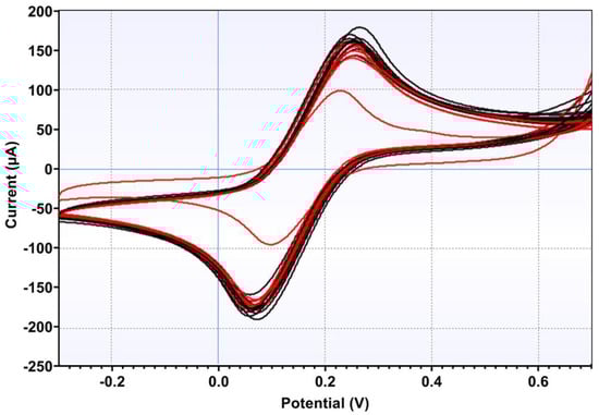 Voltammograms of saliva samples from patients with flu-like symptoms and negative RT-PCR test to detect SARS-CoV-2 (black) and COVID-19 positive patients (red). Analysis was performed using 5.0 mmol L−1 [Fe(CN)6]3−/4− in KCl 0.5 mol L−1. Scans: −0.3 to 0.7 V, E step: 0.002 V, and scan rate: 0.075 V/s.