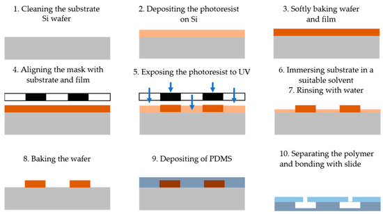 Photolithography is a technique that utilizes light to define patterns on a photosensitive material, which is then used to fabricate microfluidic devices [21]. The process is outlined in Figure 1 and consists of the following steps: (1) cleaning the substrate wafer (e.g., Si), (2) depositing a layer of photoresist onto the silicon substrate, (3) placing the wafer in an oven for soft baking, (4) aligning a photomask containing the desired microstructure pattern with the substrate and photoresist, (5) exposing the photoresist to ultraviolet (UV) light through the mask to crosslink it in the desired pattern, (6) immersing and stirring the coated substrate in a suitable solvent (the developer) to remove the exposed portions of the photoresist for positive resist or the non-exposed portions for negative resist, (7) rinsing the substrate with deionized (DI) water, (8) baking the wafer to remove residual solvent and water, (9) depositing a PDMS layer on the substrate to transfer the pattern onto the PDMS surface, and (10) separating the PDMS from the substrate and bonding it to a flat slide with inlet and outlet ports to complete the microfluidic system [22].