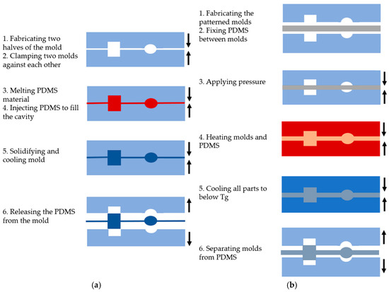 The main steps of PDMS-based microfluidic system fabrication using (a) the injection molding method; (b) the hot embossing methods.