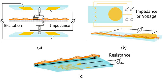 These sensors measure alterations in impedance within microfluidic pathways, enabling the assessment of cellular adhesion, proliferation, and morphology. The trans-epithelial/endothelial electrical resistance (TEER) reigns as the dominant electrical sensing method. Measured across a cell-cultured semipermeable membrane (Figure 4a), TEER quantifies barrier integrity, with high values reflecting tight junction formation. This guarantees the accurate in vivo recapitulation of permeability investigations. Additionally, TEER, with proper modeling, can reveal other aspects like cellular differentiation. Impedance spectra fitting or single-frequency measurements provide normalized cell resistance (Rcells, Ω cm2). Electrical cell-substrate impedance sensing (ECIS) offers a localized analysis of cell behavior via patterned electrodes (Figure 4b). This method extends beyond tight junctions to evaluate cellular functions [43].