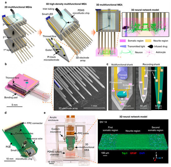 Illustrate the 3D microelectrode array’s high-density, multifunctional capabilities encompassing its design principles, fabrication techniques, packaging strategies, and integration methods. (a) illustrates the assembly process, showcasing individual 2D MEAs before stacking, the final assembled 3D MEA with a microfluidic interface, and its application to a compartmentalized 3D neural network model; (b,c) present high-resolution images of the 3D MEA and its components, including the multifunctional shank with its embedded features; (d) Displays the packaged 3D MEA with a light-emitting diode and a flexible connector. Finally, (e) Depicts the complete 3D MEA system integrated with a Microdrive and a culture chamber and showcases a 3D rendered image of a populated neural network within the system [68]. Adapted with permission from reference [68].