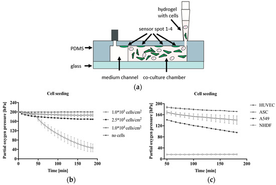 In (a) The cross-section of microfluidic chips during cell and hydrogel seeding into a gas-permeable 3D chip; (b) The effect of A549 cell density on the consumption of oxygen was recorded during 3 h of cell seeding into the chip; (c) The impact of cell type on the pressure of partial oxygen during the feeding process of cells [81]. Adapted with permission from reference [81].