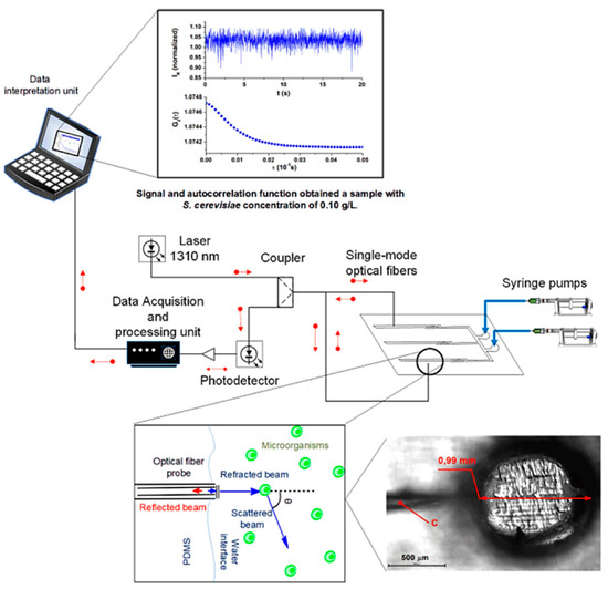 Optical sensors based on quasi-elastic light scattering have been successfully integrated with microfluidic devices for cellular growth analysis by Soares’s team [83]. The group fabricated a PDMS reversible microfluidic bioreactor comprising channels and perfusion chambers equipped with single-mode optical fibers (SMF) inserted inside the chambers during PDMS curing over 3D-printed molds. Experimentally, as shown in Figure 10, a portion of the 1310 nm laser beam launched through an SMF is transmitted to the medium containing Saccharomyces cerevisiae ATCC 7754 cells, and the other portion is reflected to the same fiber with intensity depending on the total number of cell growth. The reflected light is directed to a measurement system, a photodetector, to monitor the microbial kinetics and cell concentration.