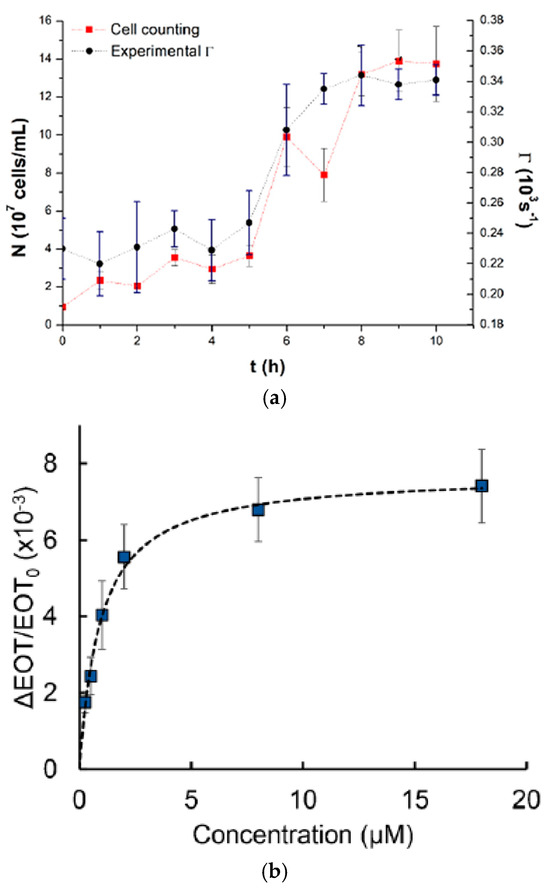 (a) The direct relationship between the cell counting (cells/ mL) curve and the average decay rate Γm vs. fermentation time using an optical fiber sensor with chamber procedure [83]; (b) Averaged relative EOT variations at different concentrations of the 60 kDa his-tagged protein from the family of Arabinanase [84]. Adapted with permission from references [83,84].