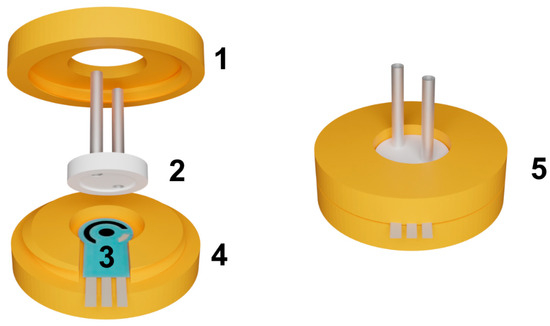The assembly of the flow-through cell. (1)–upper part of the cell with an internal thread; (2)–replaceable reactor; (3)–SPCE, (4)–bottom part of the cell with an external thread; (5)–assembled cell.