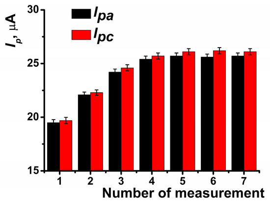 The pre-application of CB significantly enhanced the peak current by approximately 30% (Figure 3). In subsequent measurements, the peak current continued to increase until the fourth measurement, after which the coating stabilized (Figure 4).