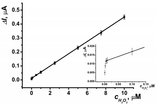 The electrode demonstrated a linear determination range for hydrogen peroxide spanning from 5 nM to 10 μM (Figure 7). The parameters of the linear regression equation for this coating were as follows: ΔI, μA = (12.21 ± 0.32) + (43.59 ± 0.18) × (c, nM), R2 = 0.9998. This system enables up to 40 measurements per hour using the same electrode.