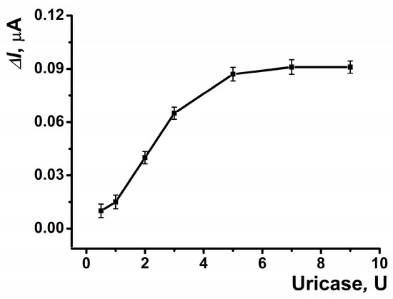 The reactor of the electrochemical cell was fabricated from PLA, utilizing its terminal carboxyl groups for carbodiimide binding to immobilize the enzyme on the inner surface of the reactor (Scheme 1). The highest response to uric acid was observed with 5 U of enzyme immobilized on the reactor surface (Figure 8).