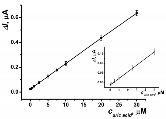 The resulting biosensor system, which incorporates an SPCE modified with CB and PB, and a reactor modified with OLA-alt (0.5 μmol) and uricase (5 U), enables the determination of uric acid in the range of 10 nM to 30 μM with a limit of detection (LOD) of 5 nM, calculated using the S/N = 3 criterion (Figure 10). The parameters of the linear regression equation for this setup are ΔI, μA = (23.46 ± 0.29) + (20.49 ± 0.08) × (c, nM), R2 = 0.9998. This biosensor system allows for up to 20 measurements per hour using the same electrode. The immobilized enzyme retained its activity under continuous flow conditions for at least 8 h. Additionally, when stored in dry conditions, 50% of its activity was retained six months post-manufacture.