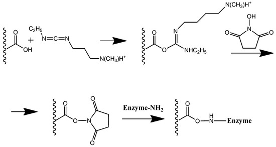 Carbodiimide binding of enzyme to PLA with terminal carboxyl groups.