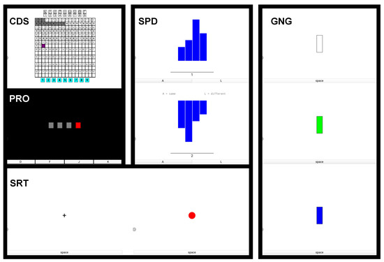 Screenshots of cognitive tasks, including code substitution (CDS), procedural reaction time (PRO), Go/No-go (GNG), spatial discrimination (SPD), and simple reaction time (SRT).