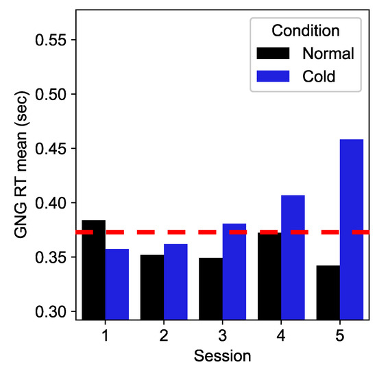 We obtained five segments from each subject, as each subject underwent five sessions during cold exposure. To account for the individual differences in cognitive task performance, individual thresholds were set to define performance deterioration per subject. Reaction time yielded in the cold condition that was slower than the 2nd slowest reaction time yielded in the normal condition (across all five sessions) was considered “deteriorated performance”, i.e., the threshold for deteriorated performance was equivalent to the 80th percentile of their baseline cognitive performance. Reaction times above the 80th percentile are considered reasonably slow, and this approach can remove outliers. Note that experimenters aimed to detect performance deterioration due to exposure only in the cold environment, as the normal environment condition was used to establish the threshold for performance deterioration. Figure 2 shows an example of finding a threshold to determine the number of deteriorated sessions in the GNG task for a given subject. In this example, cold sessions 3–5 were considered as “deteriorated in performance”, whereas sessions 1–2 were considered as “normal performance”.
