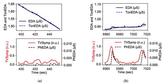 More recently, studies have shown that EDA has a high sensitivity in detecting sympathetic arousal, such as emotion, stress, and pain [27,28,29]. EDA is a measure of the skin’s electrical conductance, as the SNS activation invokes the opening of sweat gland pores [30,31]. The EDA signal is analytically processed to separate phasic and tonic components. The phasic component reflects the fast EDA dynamics (i.e., rapid changes) in response to a startle-like stimulus, while the slower tonic component (i.e., gradual changes) has been shown to be related to passive indicators of sympathetic activity, related to factors such as hydration levels and skin temperature [27]. Recent work has shown that EDA can also be analyzed in both the time and frequency domains, which captures time-varying dynamics, and is termed as the time-varying index of EDA (TVSymp). This metric has shown higher sensitivity and consistency in assessing SNS activity when compared to the phasic and tonic components of EDA [32,33,34,35]. For example, recent studies have shown that TVSymp more accurately detects cognitive performance deterioration than either the tonic or phasic EDA components [36,37].