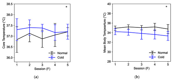 (a) Reaction time of the core temperature; (b) reaction time of the mean body temperature (mean ± SD). Asterisks represent significant differences in performance between normal and cold conditions.