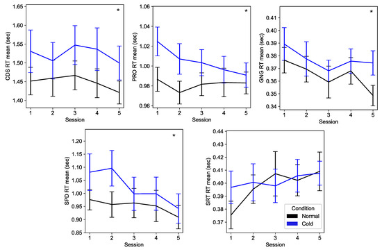 Figure 6 shows a comparison of the reaction time of each cognitive task between normal and cold conditions across five sessions. Significant performance deterioration in the cold condition was observed during CDS (F(1,135) = 17.408, p < 0.001), PRO (F(1,162) = 27.847, p < 0.001), GNG (F(1,161) = 8.743, p = 0.004), and SPD (F(1,144) = 13.376, p < 0.001) compared to the normal condition. SRT did not show significant performance deterioration. Therefore, we excluded SRT in our analysis. Due to software errors during data collection, we excluded three and two subjects from CDS and SPD, respectively (Table 4). Our two-way ANOVA analysis did not detect significant interactions between condition and exposure time.