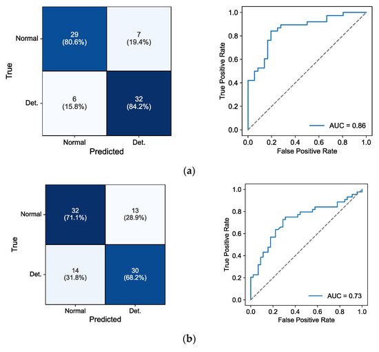 (a) Confusion matrices (left) and ROC curves (right) of SVM with HRV features for CDS; (b) confusion matrices (left) and ROC curves (right) of SVM with EDA + HRV features for GNG. Det—deteriorated session; AUC—area under the curve.