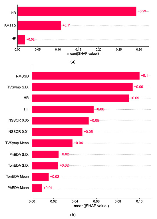 Figure 8a,b show SHAP analyses on detecting performance deterioration in CDS using SVM with HRV features and in GNG using SVM with HRV + EDA features, respectively. Our SHAP analysis from the CDS model showed that HR was the most impactful feature, followed by RMSSD. HF was the least impactful feature for the classifier. For the analysis of GNG, we showed that HRV features were ranked at 1st, 2nd, and 4th in the most important features list. For EDA, TVSymp’s S.D. was the most important and ranked at the 3rd among all features, followed by NSSCR.